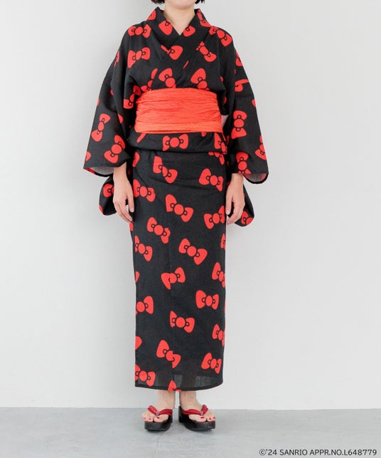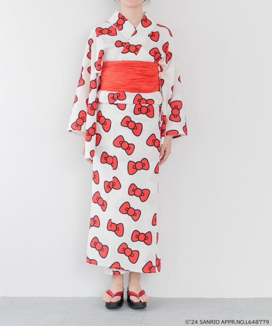 兵児帯がセットになったリボン柄の浴衣。ハローキティのトレードマークでもあるリボン柄の浴衣は、ポップさもありつつ一目で“カワイイ”が伝わるLOWRYS FARMならではのアイテムです。