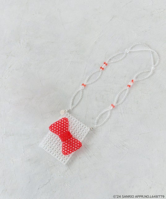 ハローキティのトレードマークでもあるリボンを大きくフロントに付けたスマホショルダーバッグ。ショルダー部分にも小さなリボン型ビーズを施し、細部にもこだわったアイテム。