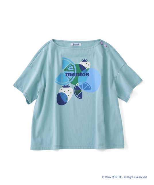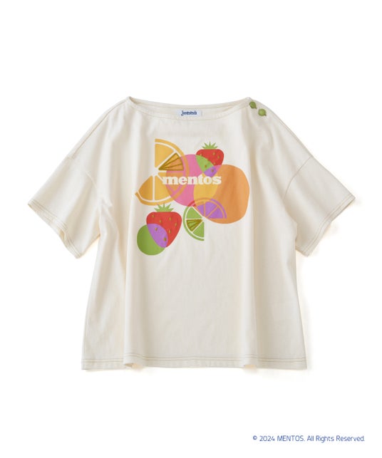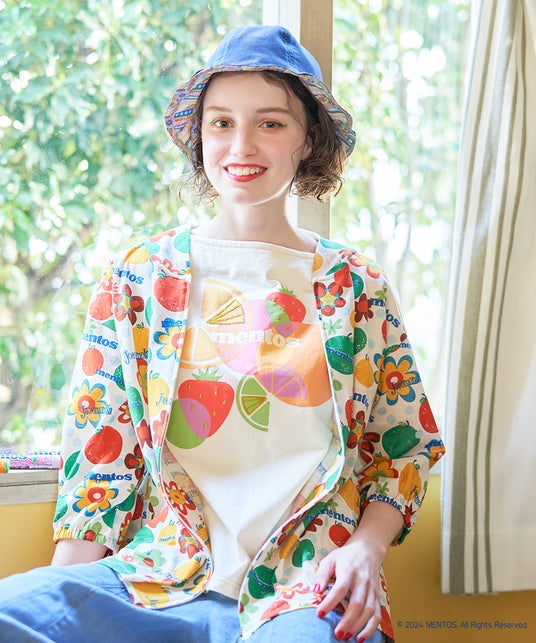 メントスのフルーツ柄を前身頃へ大胆に、ホコモモラらしくプリントと刺繍を組み合わせて表現。左肩部分にメントスに見立てた丸い釦を付けています。