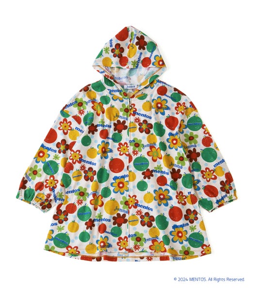 メントスのグリーンアップルとホコモモラのお花を組み合わせ、それぞれのブランドロゴを散りばめた総柄のプリント生地を作成。さらりとした着心地の良い素材感です。メントスをイメージした丸いファスナーチャームがポイントのパーカーです。