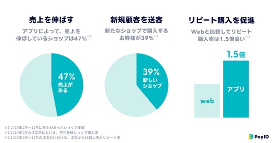「Pay IDアプリ」を利用しているユーザーのうち、ショップの新規顧客としてアプリ経由で商品の購入につながったケースが39%あり、新規顧客の送客に貢献しています。