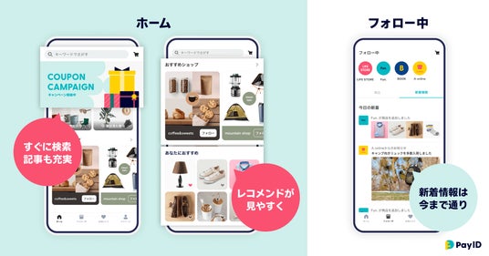「Pay IDアプリ」は、アプリにアクセスされたユーザーさまと、おすすめの商品やショップのマッチング率を高めることを目的にこの度のアプリホーム画面のアップデートいたしました。「Pay ID」はこれまでもアプリを通じてショップとファンの出会いの創出やリピーターづくりをサポートしており、新規顧客の送客、リピート購入に貢献してまいりましたが、「Pay ID」が保有する購入者データをもとに「BASE」を利用されているショップのさらなる新規顧客の集客・販促の設計強化に向けて、まずはホーム画面のアップデートを実施いたしました。