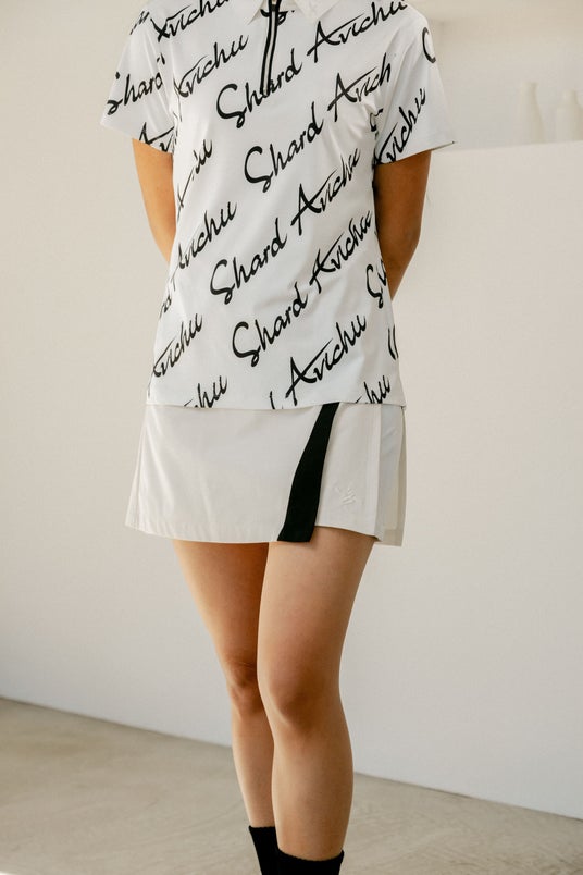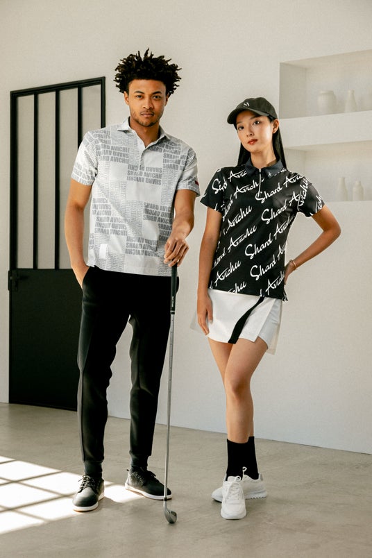 ダイナミックなデザインは、ゴルフ場で映える 胸元はボタンを使用せずに、ジップアップを使 用する事でエレガントと清潔感を醸し出す