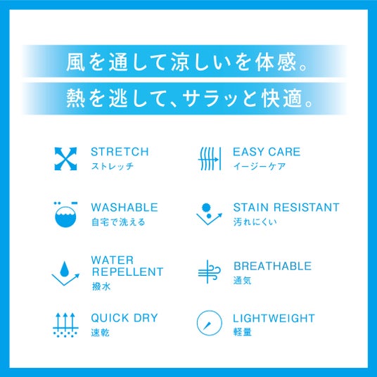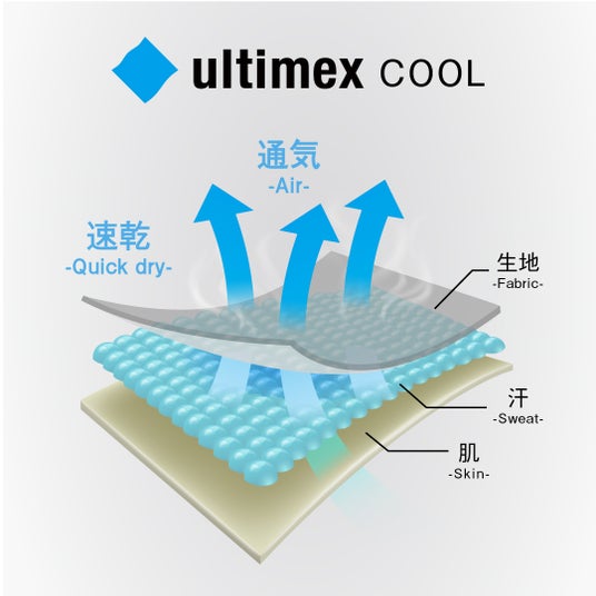 本商品は、高温多湿の夏に向けた自社素材「ultimex COOL/アルティメックスクール」を使用しています。通気性を上げるための 見た目を損なわない細かな通気孔が、蒸れにくく快適な着心地を実現。さらに、軽量で、ストレッチ性にも優れているため腕や肩回りの可動域を広げてくれます。また、速乾と撥水に優れているので汗によるべたつきを解消し、突然の雨にも対応いたします。肌触りは天然素材のように柔らかく、染色にこだわった深みのあるカラーとなっています。