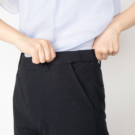 見た目を損なわない細かな通気孔があいた、高温多湿の夏に適した自社素材「ultimex COOL/アルティメックスクール」を使用。染色にこだわり、深みのあるカラーに仕上げました。高いストレッチ性を持ち、速乾と撥水に優れているので汗によるべたつきを解消し、突然の雨にもしっかり対応いたします。パンツのウエストは両サイドにゴムを内蔵することで、約4cm程度の伸縮性を持たせ、スタイリッシュな見た目と動きやすさを同時に実現。また、お尻周りに裏地を付けることで、下着の透けを防止。センタープレス入りで、脚長効果も期待できるデザイン仕上げました。
