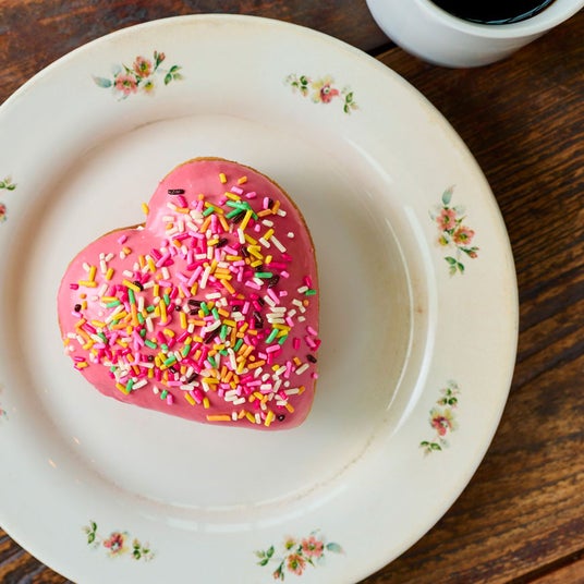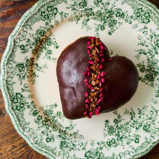 ストロベリーハート 400円(税込)RACINES DONUTでも一番人気を競う商品「チョコレート&5色のスプレーチョコ」をストロベリーチョコレートを使用してアレンジしました。老若男女に大人気の商品を母の日限定商品としてアップデートしています。中にはチョコハートと同じく、生クリームを詰めました。