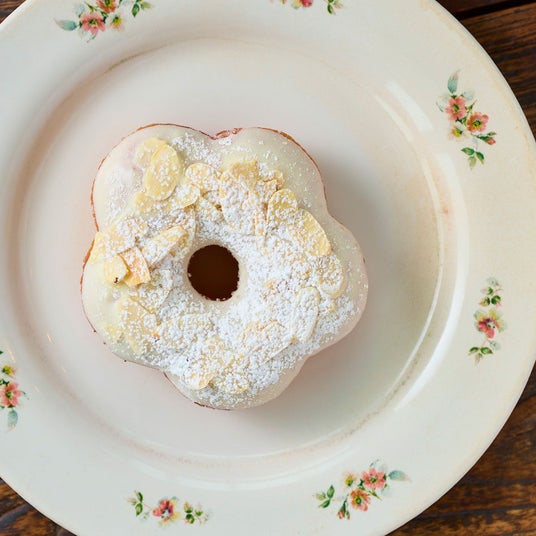 ホワイトチョコフラワー 400円(税込)真っ白で美しい花をイメージして考案したドーナツ。ブリオッシュ生地を花形に成形し、ホワイトチョコレートでコーティング。アーモンドスライスと粉糖をトッピングしました。チョコの甘さとアーモンドの食感がクセになるドーナツです。
