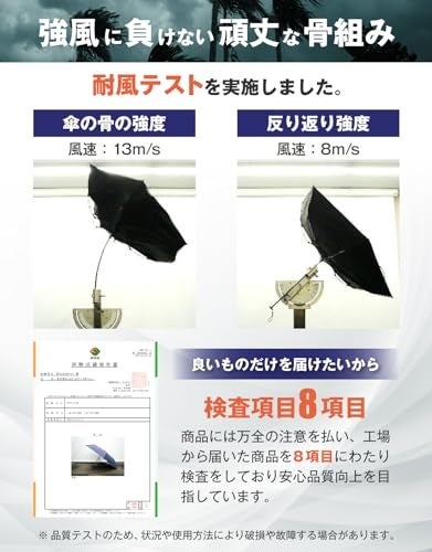 専門機関で行った耐風テストでは風速13m/sをクリア。強さも兼ね備えた「 Wish Liszt 」の折り畳み傘は、1本1本の商品にも万全の注意を払い、工場から届いた商品を8項目以上にわたり全品検査をしており安心品質向上を目指しています。