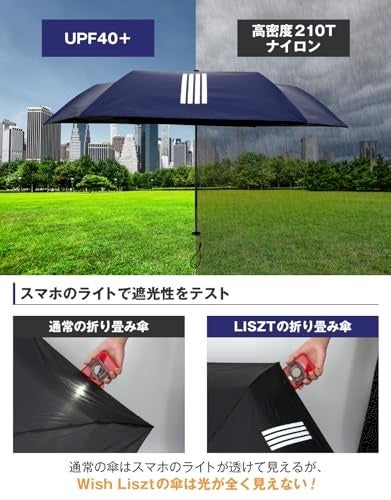 「Wish Liszt」は小さいだけでなく機能性も高く、高級アウトドアテントなどにも使われる超撥水高密度210Tナイロンを使用、しっかりと雨や紫外線(UPF40以上)を防ぎます。耐水圧も紫外線遮蔽率も高く、雨の日も晴れの日も毎日使える傘になりました。