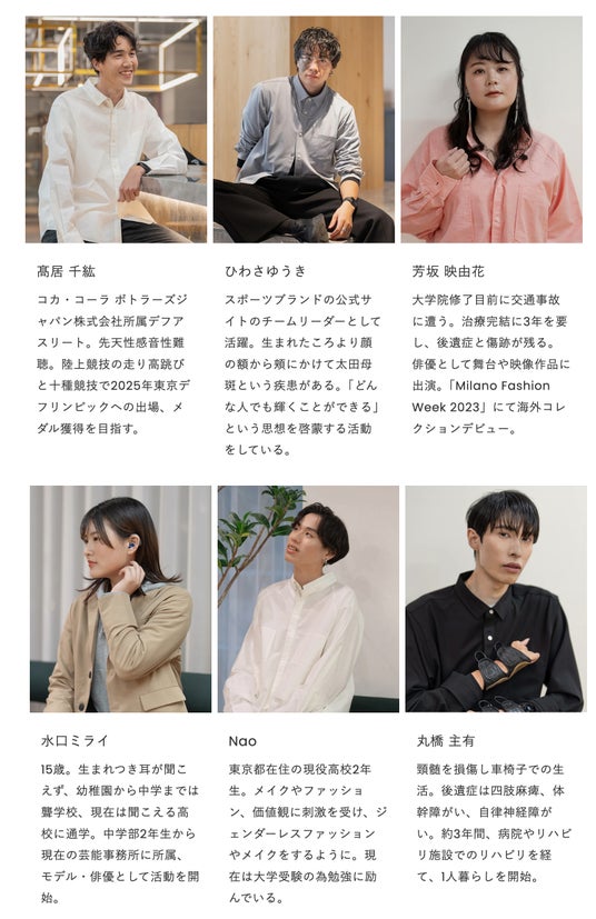 今回、ランウェイに共に出場したモデルには、世界で活躍するろう俳優を目指す高校生や、車椅子モデルではなく一人の人間としての挑戦を決めたモデルなど、多様なバックグラウンドを持つ6名を起用。