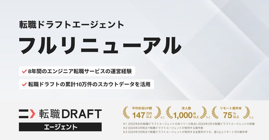 株式会社リブセンス(代表取締役社長:村上太一、本社:東京都港区、証券コード:6054)が運営するITエンジニア限定の転職サービス『転職ドラフト』(URL:https://job-draft.jp/)は、2021年より限定的に展開していたITエンジニア専業の転職エージェント「転職ドラフトエージェント」(URL:https://agent.job-draft.jp/)のサービスをフルリニューアルしましたのでお知らせします。サービス提供体制の強化とサービスページのリニューアルを行い、これまで以上にITエンジニアの転職・キャリア支援に注力します。