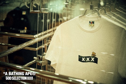 「GOD SELECTION XXX」とのコラボコレクションは、2024年4月28日(日)にA BATHING APE(R)正規取扱い店舗およびBAPE.COM WEB STOREの正規取り扱い店舗、「GOD SELECTION XXX」にて、数量限定で発売します。