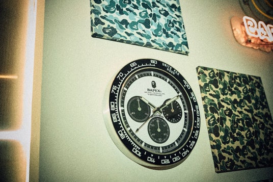 BAPEX(TM)️型ウォールクロックやBAPE(R)︎ BEEキーホルダーもラインアップ。目線を隠したAPE HEADがコラボレーションを象徴します。