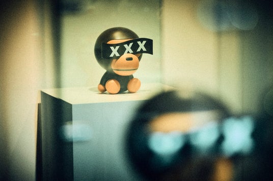 「XXX」のロゴで目線を隠したBABY MILO(R)︎フィギュアが、いつもと違う表情で新鮮。
