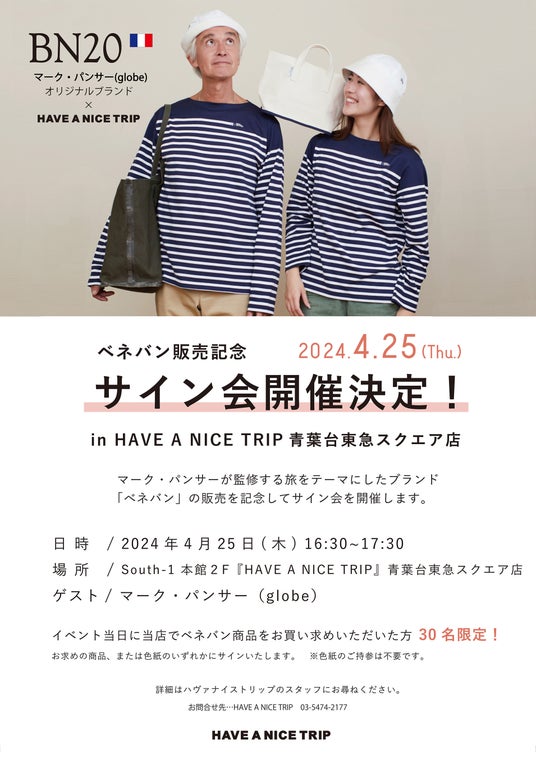 4月25日よりハヴァナイストリップ青葉台東急スクエア店にて、旅をテーマにしたブランド「BN20F(べネバン)」の先行販売を開始いたします。この記念すべき販売スタートにあたり、当ブランドのプロデューサーであるマーク・パンサー(globe)をお招きして、サイン会を開催いたします。