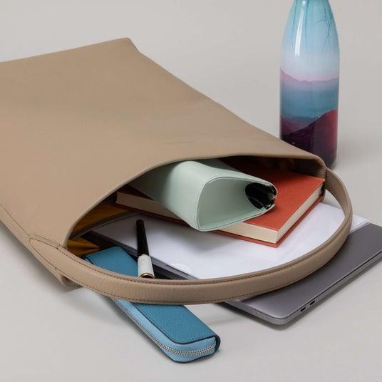普段使いのバッグと、書類やパソコン用のバッグをふたつ持ち歩く女性を街で多く見かけますが、これをひとつに美しくまとめられるバッグを作りたかったのです。毎日快適にお使いいただくために、本革の持つ美しさや柔らかな質感は残しながら、とにかく軽さにこだわりました。書類とパソコンが固定できる専用のポケットを採用し、肩に掛けると重さを感じにくく、仕分けしやすい設計にしました。また、上部にマグネットが付いており、書類やパソコンの持ち運びも安心です。A4書類はもちろん、14インチのパソコンまではマグネットを閉めてお使いいただけます。