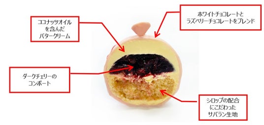 暑い夏でもすっきり召し上がっていただくため、サバラン生地に含ませるシロップの配合にこだわりました。ノンアルコールの白ワインをベースに、ジュニパーベリーを入れて煮だしたサバラン生地とダークチェリーのコンポートを、ココナッツオイルを使用したバタークリームで包みました。その上からホワイトチョコレートとラズベリーチョコレートのブレンドチョコレートでコーティング。
