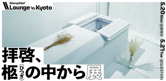 このような生活者の価値観の変化を受けて、今回の「Disruption(R) Lounge」~終わりのはじめかた~ では、死・終わり・撤退などの“終わり”に寄り添ってきた株式会社むじょう、そして、生活者にとって難しいと感じる仏教の教えをより親しみを感じてもらう取り組みを行っている佛現寺、さらに、京都で人・事業・地域をつなぐ取り組みを行っている京都信用金庫との共創より実施に至りました。本イベントでは、世の中でタブーとされてきた「終わり」について向き合い、「『終わりのはじめかた』について考える」をテーマに展示会「拝啓、柩(ひつぎ)の中から展」を5月20日(月)と21日(火)の2日間にわたり開催します。さらに、21日(火)には、本イベントを共創するパートナーである株式会社むじょう 代表取締役 前田 陽汰氏と、佛現寺 副住職 油小路 和貴氏を迎え、京都信用金庫が運営する共創施設「Question」にてトークセッションを行います。