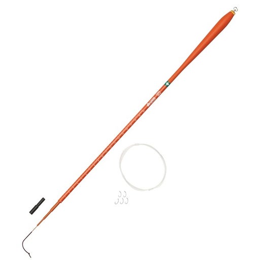 竿本体は万が一落としても見つけやすい、フィールドで目立つオレンジカラーを採用しました。持ち手部分に20cmの目盛りが付いているため、釣った魚の大きさをすぐに測ることができ、お子様の自然学習にも役立ちます。全長180cmまで伸び、使わない時は短く収納できる伸縮式です。 竿本体の素材には、軽量かつ高強度で腐食しにくい特長を持つカーボンを採用しています。