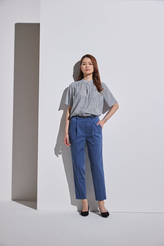 涼しさに特化したポイントとして、綾織から平織に変更したことで通気性がアップ。さらに、お求めやすい価格へと変更するなどアップデートいたしました。カラー展開は涼しげなブルー・グリーンを加えた5色展開で、夏のオフィスカジュアルスタイルの幅が広がります。