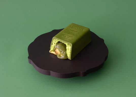 宇治抹茶を盛大に練り込んだバターチョコレートのシェルに、宇治抹茶のムースリーヌ(カスタードとバターのクリーム)、そして宇治抹茶を豪快に練り込んでコトコト煮込んだバタースカッチキャラメルソースを注ぎ込み、ビスキュイ黒糖シロップに漬け込んだビスキュイ(スポンジケーキ)とムースリーヌを敷き込んだバターケーキ。