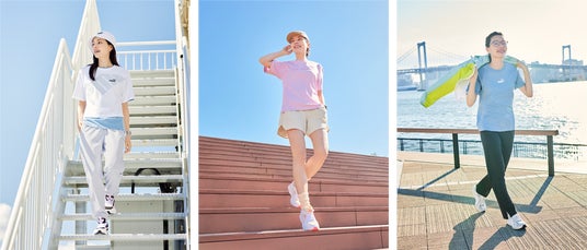 「PUMA MIX CLOTH -いつでも快適な着心地を-」のコンセプトの元、快適な着心地でオールシーズンストレスフリーに過ごせる新素材「PUMA MIX CLOTH」使用したTシャツを中心にファッショナブルに、アクティブに過ごせる夏の新作アイテムを展開します。「PUMA MIX CLOTH」は表面にカジュアルな見た目のコットン、裏面に吸水速乾性に優れたポリエステルの生地を採用していることにより、サラッとした快適さをキープ。お出かけやスポーツなど様々なシーンで着用できます。紫外線カットのメリットや、速乾性に優れたポリエステル混素材によりコットンと比較して乾きやすい特性もあり、女性の夏のライフスタイルシーンをサポートします。プロモーション動画では、「PUMA MIX CLOTH」の機能である「SOFT TOUCH & DRY」、「UV CUT」、「EASY LAUNDRY」の3つのテーマをそれぞれのスタイルとともに紹介し、「PUMA MIX CLOTH」を身にまとい、快適な着心地を感じながら気持ちよく過ごす日常を表現しています。