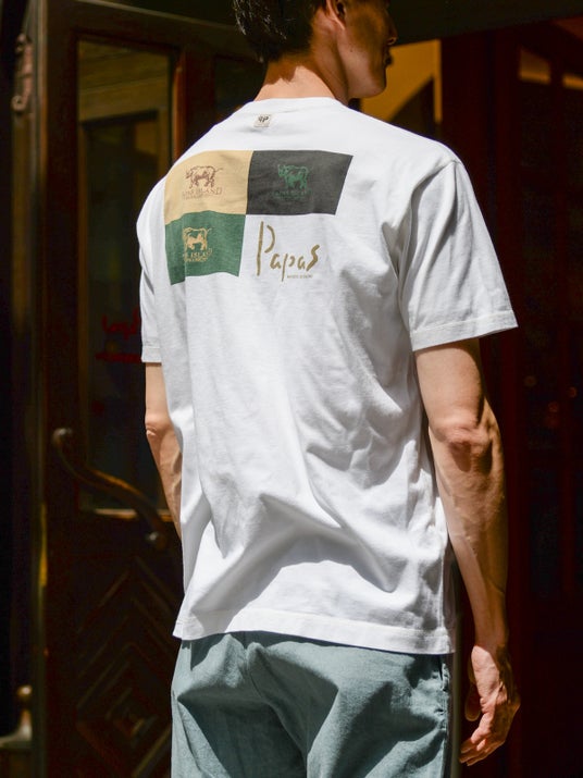 パパスのアイコンの一つであるサイを背中にプリントした、WEB SHOP限定のスペシャルなTシャツ。袖にもさりげなくサイのネームを施し、パパスらしさいっぱいに仕上げました。お洒落な配色で、もちろん着心地も良く、この夏大活躍間違いなしの一着です。