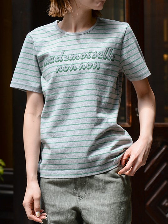 味わい深い色合いのボーダー生地を使用したWEB限定Tシャツです!胸元にはロゴプリント、後ろ首元にはロゴネームを施しました。パンツにもスカートにも合わせやすく春夏に活躍してくれる一着です。