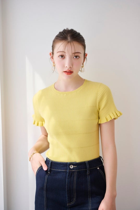 <Style 2>変形リブとフリルスリーブが華奢見えをアシスト