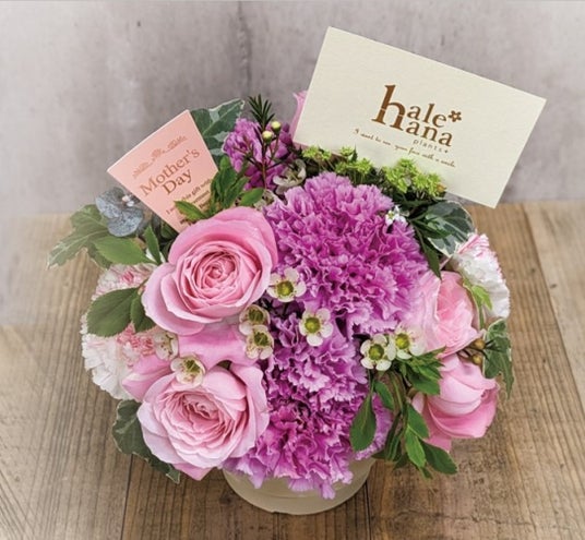 「hale-hana plants+」店頭でのご注文限定で、母の日の特別な生花アレンジメント販売も受付中です。華やかなブーケと、花瓶いらずでそのまま飾れるアレンジを取り揃えており、今年はシックなレッド系と優しいピンク系に加えて、暖色系で色とりどりの豪華なデザインをご提案。贈る方に合ったイメージを選ぶことができます。母の日限定のメッセージカード付き。