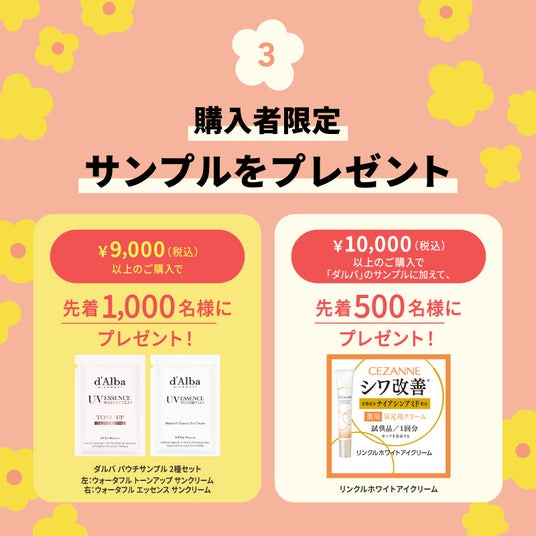 また、10,000円(税込)以上のご購入で、「ダルバ パウチサンプル 2種セット」に加えて「CEZANNE リンクルホワイトアイクリーム」を先着500名様にプレゼントします。