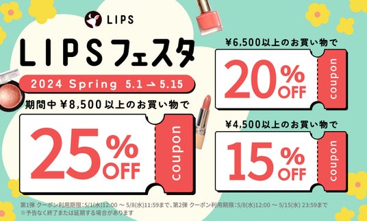 2024年5月1日(水)12:00より実施される「LIPSフェスタ 2024 Spring」では、3種類のクーポン配布はもちろんのこと、一部対象商品の購入ポイント還元率が大幅UPするなど、ご愛顧いただく多くのユーザーに喜んでいただけるものを企画しています。
