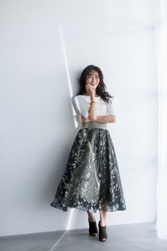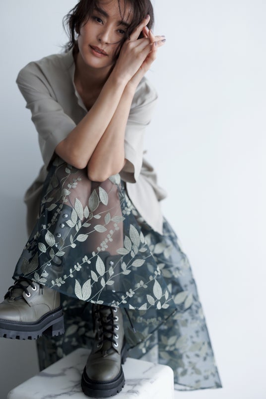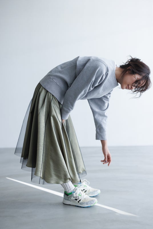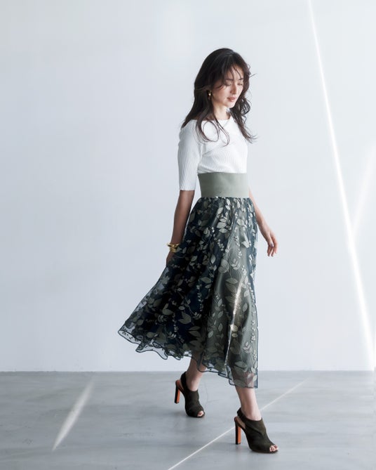 クリス-ウェブ 佳子さんとレキップのコラボレーションアイテムvol2が発売に。自身がステートメントアイテムと呼ぶレース刺繍×チュールのドラマチックなスカート、ツィストデザインのニット、サテン地のキャロットパンツ、ブラックジーンズというラインアップ。