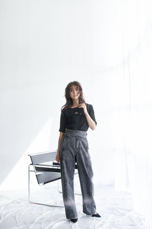 私自身大好きだった前作のオフホワイトパンツが人気で、シルエットをいかしたブラックデニムを製作。肌馴染みの良い生地感なので、一年を通じてストレスフリーで楽しめます。Black High-waisted Jeans ¥33,000 Twisted Front Ribbed-Knit ¥30,800