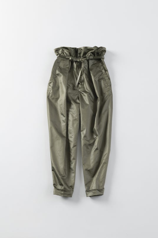 Stretch Satin Carrot Pants ¥33,000ヒップ周りにはゆとりがあり、裾に向かって細くなっていくシルエットが人参のようなことからキャロットパンツと呼ばれているアイテム。自宅のクローゼットで眠っていた大好きなマスタードイェローのサテンパンツを今風にアップデート。セージグリーンの張り感のあるサテン地で。