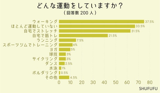 どんな運動をしているかに関しては1位「ウォーキング(37.5%)」、2位「ほとんど運動していない(33.5%)」でした。ウォーキングは老若男女問わず誰でも簡単に行える点が人気なのかもしれませんね。