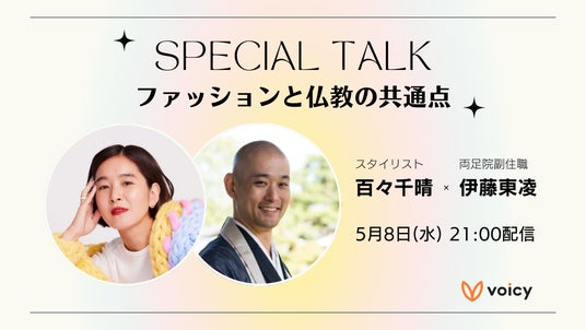 株式会社Voicyが運営する音声プラットフォームVoicyは、スタイリスト 百々千晴さんと、僧侶 伊藤東凌さんによる特別対談を、2024年5月8日(水) 21時よりプレミア公開します。テーマは「ファッションと仏教の共通点」。ファッションと日常生活の心がけや、仏教との共通点などについて語ります。Voicyは新たな音声コンテンツの提供を通して、より音声を楽しむ機会をつくっていきます。