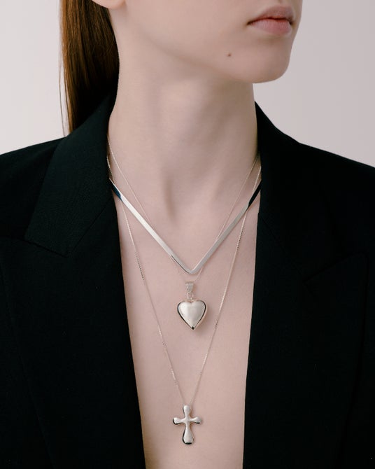 アイコニックなハートモチーフをモダンに解釈したコンテンポラリーなムード漂うネックレス。