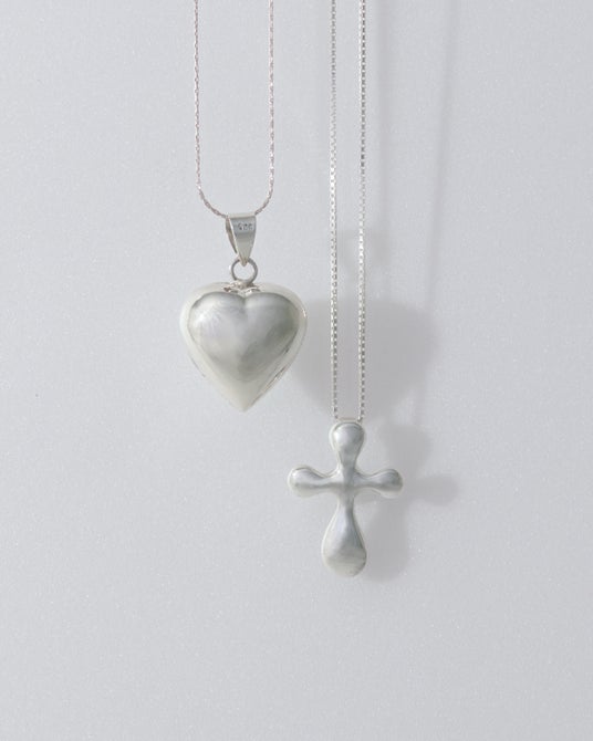 立体的で丸みのあるハートモチーフは光を反射し、シルバーの艶めきを強調します。
