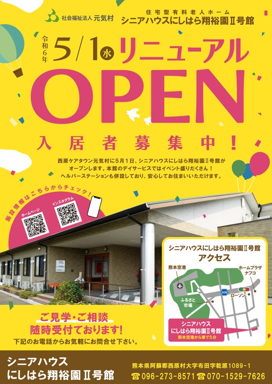 令和6年5月1日 熊本県阿蘇郡西原村に住宅型有料老人ホーム「シニアハウスにしはら翔裕園II号館」をオープンいたします。