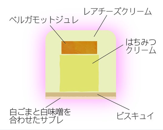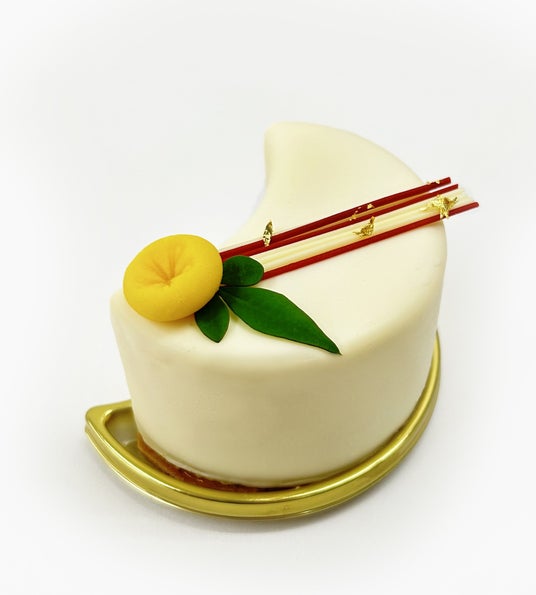 ベルガモットジュレとはちみつのクリームをレアチーズクリームで包み、土台に白ごまと白味噌のサブレを合わせました。柚子の皮を練り込んだ柚子風味の白あんと、水引をイメージした紅白のチョコレートをトッピング。その上から金箔をあしらいました。丸みを帯びた柔らかなカーブで温かさを演出しています。