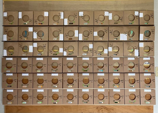 そこで今回は普段の展示とは趣向を変えて7inchレコードのブランクのジャケットとインナースリーブに絵を描きました。ネームラベルも貼ってあるので入れ間違いはなくなりますし、探し出すのもラクになります。