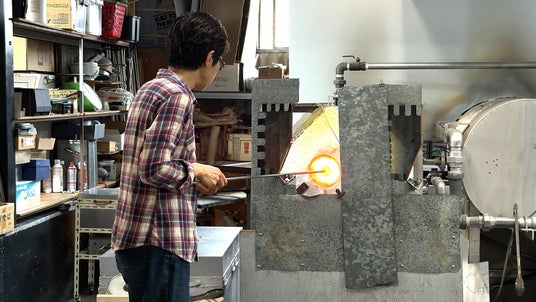 解体が完了したガラスをカレット状にし、1100℃という高温の炉に入れていきます。10時間以上かけて炉内で溶かし、次の姿に生まれ変わるのを待ちます。線香花火のように筒の先にくっついたガラス。ここから職人の技でゆっくりと膨らませていきます。