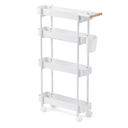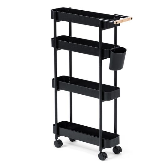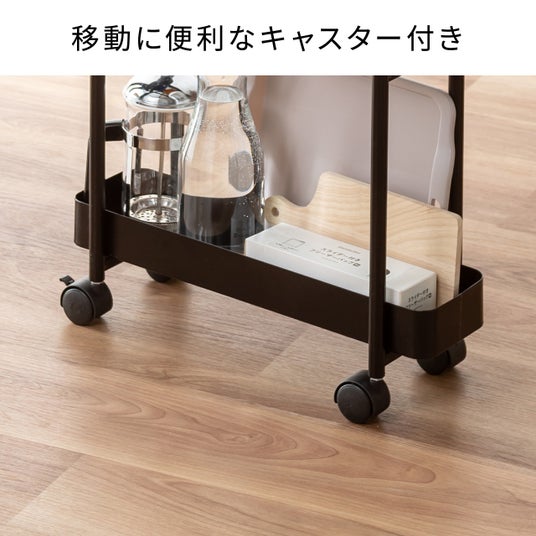 小物を収納できるボックス付きで移動ができ、リビングやキッチンなどに収納可能な幅17cmの隙間で使用できる、スリムタイプのキャスター付きキャリーワゴン