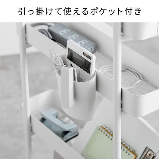 新製品のスリムワゴンは、17cmの幅でありながら、隙間収納が可能なため、限られたスペースを有効活用できます。メッシュ形状の底面は通気性がよく、ほこりが溜まりにくいため、衛生的な収納が可能です。また、付属の樹脂製ポケットにより、収納手段が増え、利便性が高まります。