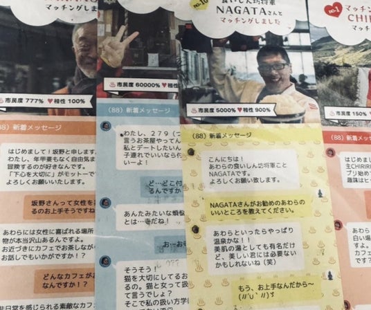 ターゲットは、従来の観光に満足してない 20~30 代のグループやファミリーとし、ガチャの構成およびデザインは、その世代に馴染み深いマッチングアプリをオマージュしたデザインとしました。ガチャを回すとカプセルには、市民がおすすめスポットをデート形式で回遊する動画およびその市民の顔が描かれた缶バッジが入手でき、市民との「マッチング」が成立します。動画は台本なしで作成したものであり、市民との交流を疑似体験できることを目指しました。