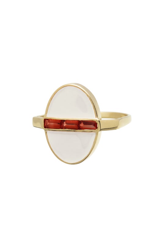 また、湖の静寂を象徴するホワイトエナメルには情熱的な夕焼けを象徴するかのようにガーネットのバゲットがあしらわれ、そのカラーコントラストがアールデコの視覚的な魅力を放ちます。