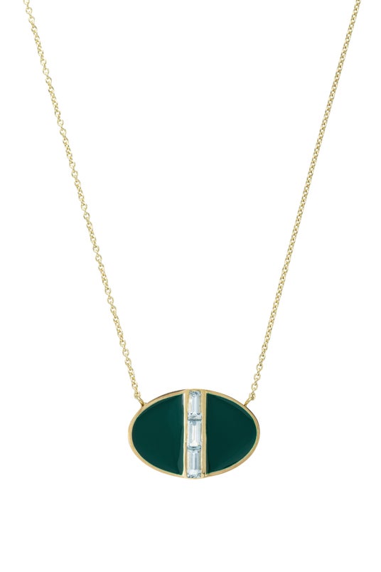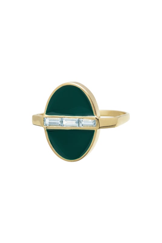 湖をイメージしたオーバルシェイプに深緑のエナメルと中央に配されたバゲットカットのアクアマリンは、マラカイボ湖の深い水の静けさと透明感を象徴。