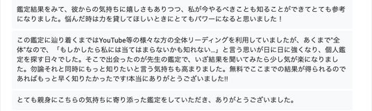 『はじめまして。占い師の聖子ともうします。こうしてこちらをご覧頂いているということは何か恋愛への悩みがあるからだと思います。「80億」これが何の数字だかわかりますか?これは世界の現在の人口数です。片思いのあの人、復縁したいあの人、秘密の恋をしているあの人…、あなたと彼は80億分の1の確率で出会ったまさに「奇跡」です。そんな奇跡を悲しい奇跡としてではなく、幸せな奇跡だと信じれるような、不安や悲しみを取り除き前向きな気持ちに向かって頂ける鑑定を心がけております。何か恋愛のお悩みがあるのでしたら是非、私にご相談下さいませ。』