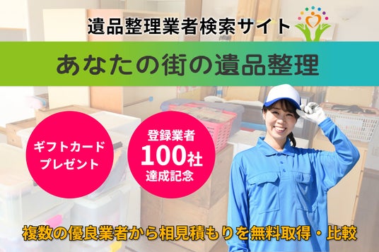 遺品整理の相談から業者の紹介までを無料サポートするサイト「あなたの街の遺品整理」を運営するハウスドクター(広島県広島市、猪待子代表取締役)は、登録業者が100社を超えたことを記念して、成約者へギフトカードをプレゼントするキャンペーンを開催しています。初めての遺品整理に不安を抱える方や、遠方に暮らす家族の遺品整理にお悩みの方などは、この機会に安心・簡単・お得な「あなたの街の遺品整理」をご利用ください!